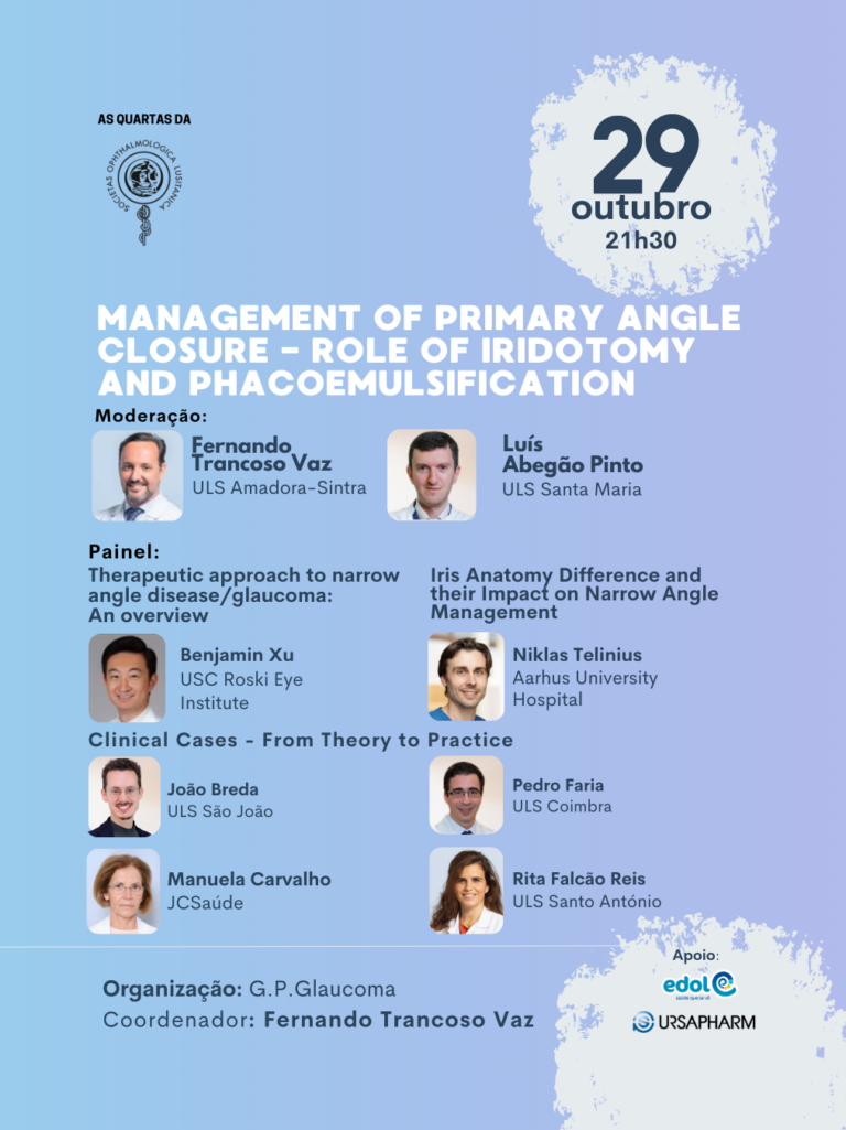 No dia 29 de outubro decorre mais um webinar “As Quartas SPO”, subordinado ao tema “Management of Primary Angle Closure – Role of Iridotomy and Phacoemulsification”. A sessão tem início às 21h30.