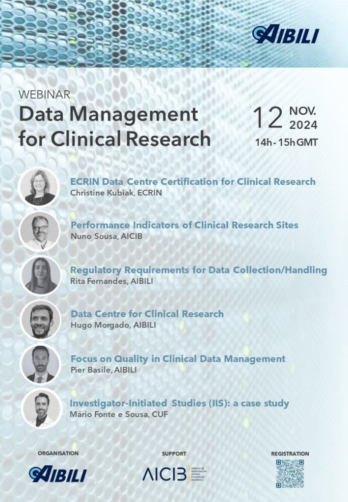 A formação online está agendada para 12 de novembro, entre as 14h e as 15h, onde serão abordados temas relevantes para a gestão de dados em investigação clínica, nomeadamente, requisitos, coleção e gestão de dados de saúde a nível europeu e nacional.